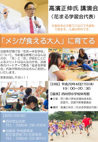 4月27日(木)、『官民一体型学校武雄花まる学園』の取組を連携して進めている「花まる学習会」代表の高濱正伸氏を講師としてお迎えし、西川登町にて講演会を開催します。 講演会では、花まる学習会の取組や教育理念、「官」と「民」が連携することのメリ…
