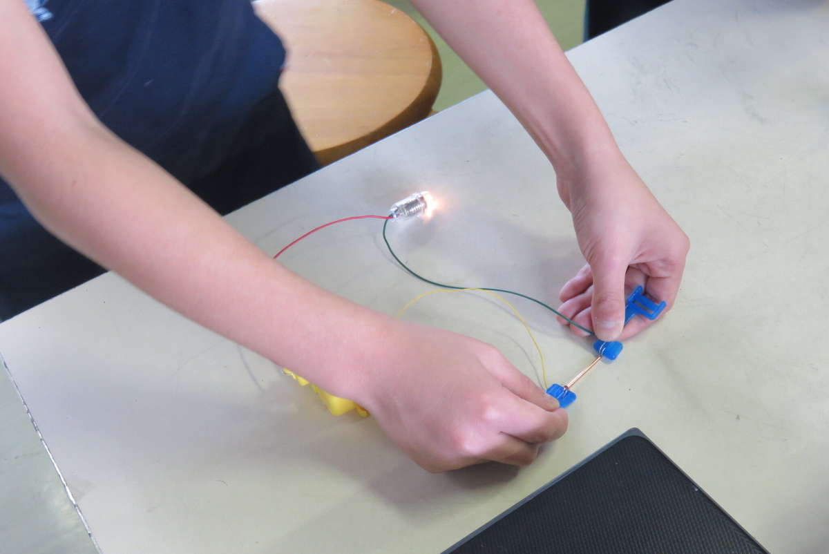 その回路の途中に様々な素材のものをつなげて電気が通り豆電球が点くのか実験します。